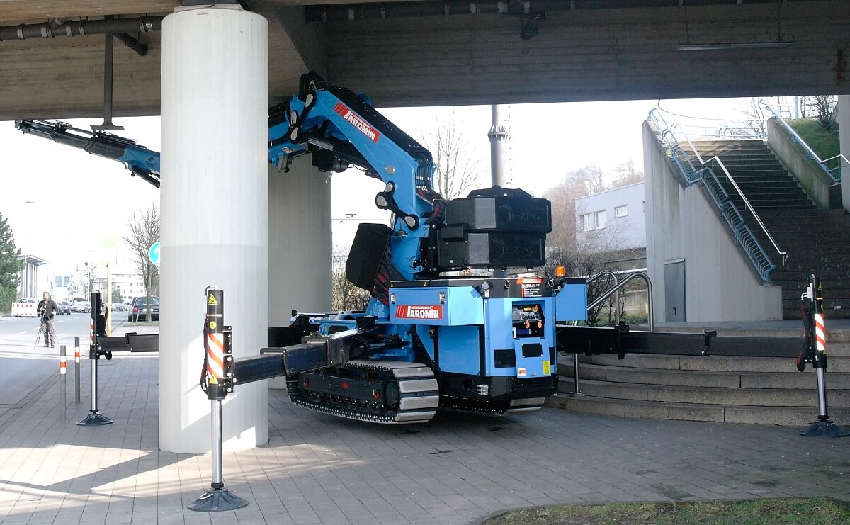Dank des zusätzlichen Gelenks eröffnen sich mit dem JF545 ganz neue Arbeitsabläufe. Auch Hubarbeiten über Hindernisse hinweg können so realisiert werden. Durch die Steuerung über Fernbedienung bleibt die Last dabei immer im Blick des Bedieners. Der JF545 füllt damit endlich die Lücke zwischen klassischem Minikran und großem Baukran.